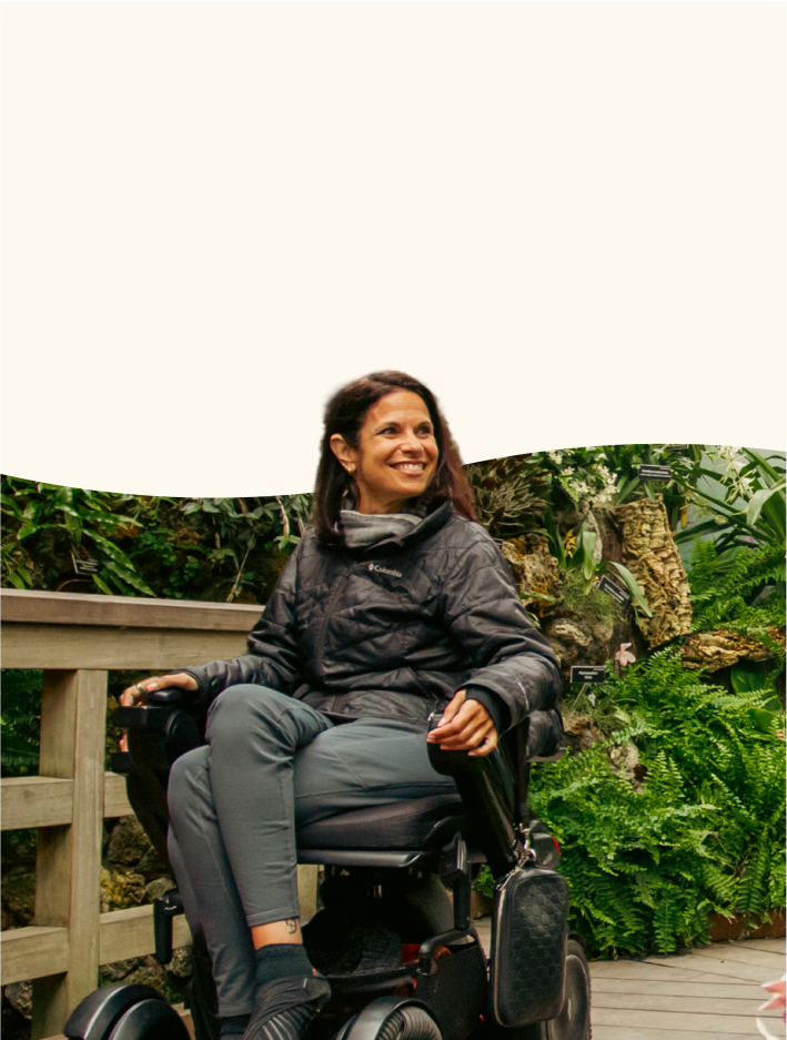 A woman in a power wheelchair strolling through a flowery place